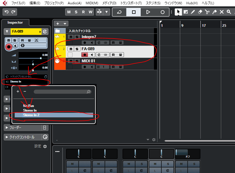 なので、CUBASEのオーディオトラックを作って、inspectorで、INPUTをオーディオコネクションで設定したStereo in Stereo in,2のどちらかを選べば、オーディオトラックに録音できそう!となるのです。