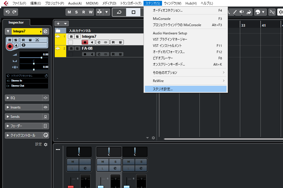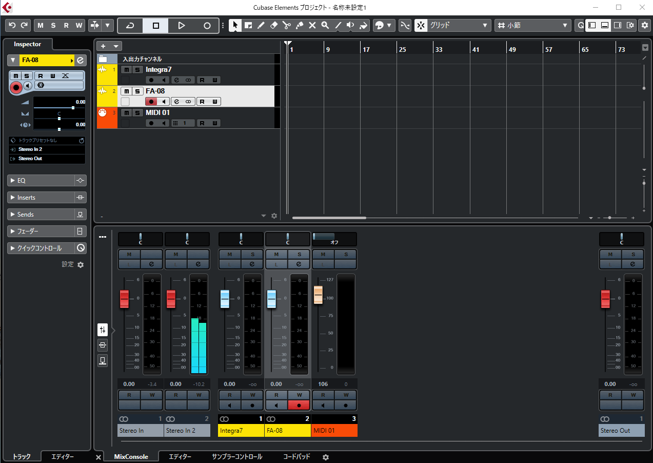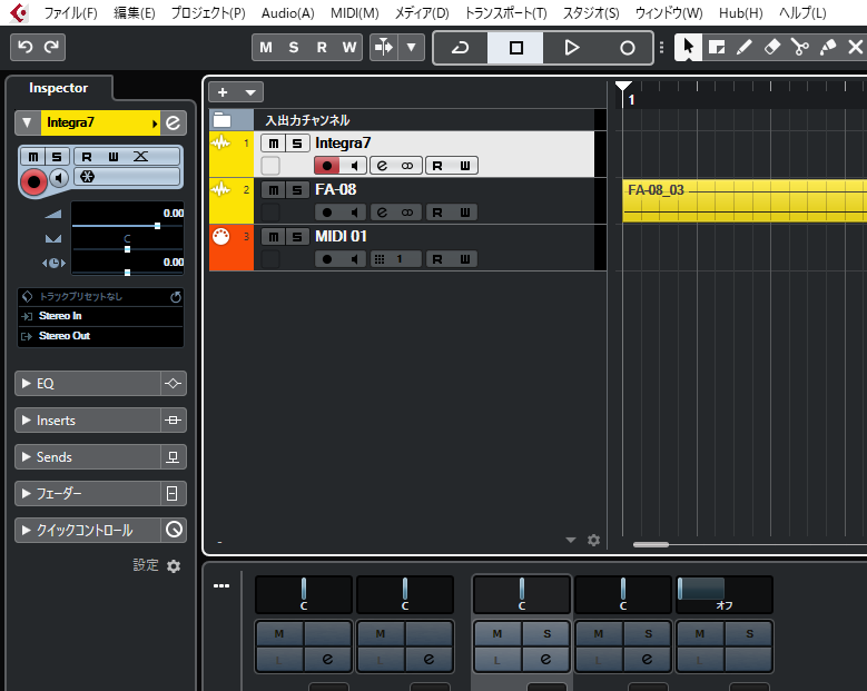 さて、二つ目のオーディオトラックのinspectorで、INPUTをStereo in 2(FA-08)の設定したので、使えるかなと思い、Stereo in 2につながっているFA-08を弾いてみます。