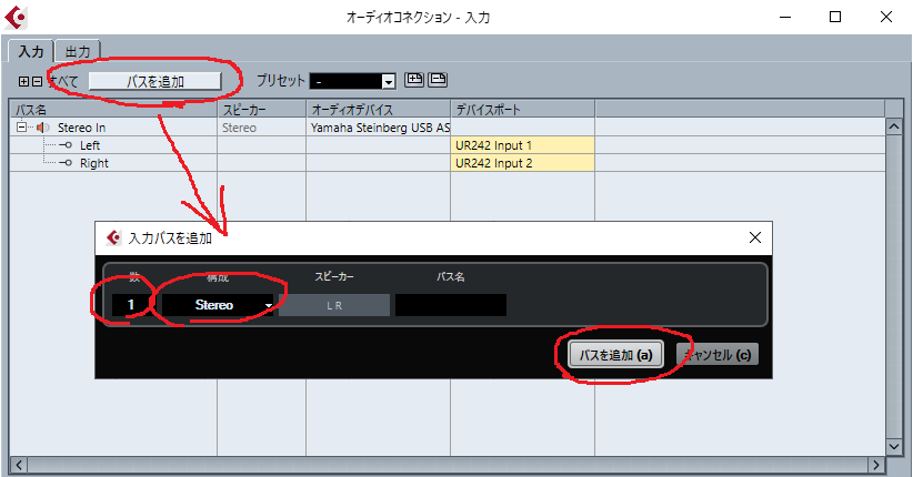 入力タブで、バスを追加して、1 Stereo パスを追加を押します。