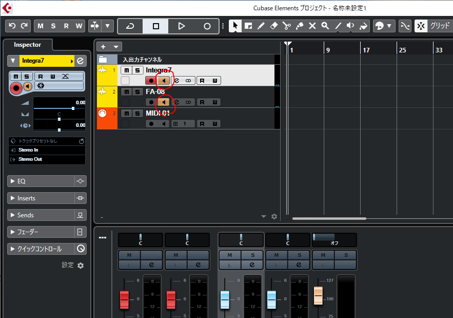 これに気づけは、あとは調べるのも簡単でした。Cubaseでモニターするためには、以下のように、スピーカーのマークを押します。