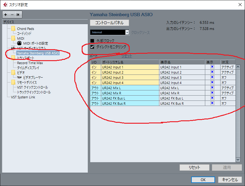 ここで、UR242のinput1,2がCUBASEにおけるStereo in、UR242のinput3,4がCUBASEにおけるStereo in 2として定義されたのです。