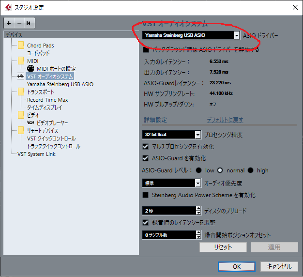 VSTオーディオシステムを選択し、右側で「Yamaha Steinberg USB ASIO」を選択します。