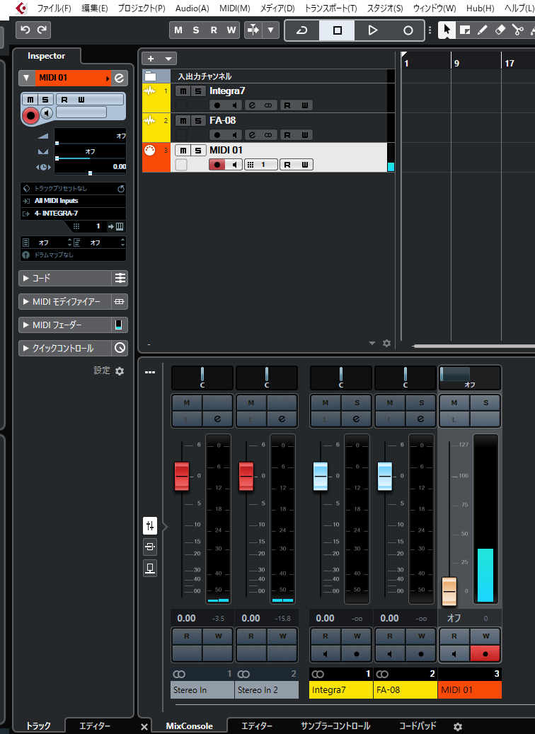 弾いてみると、MIDIトラックは反応しています。この時、INTEGRA-7も音を出力しています。