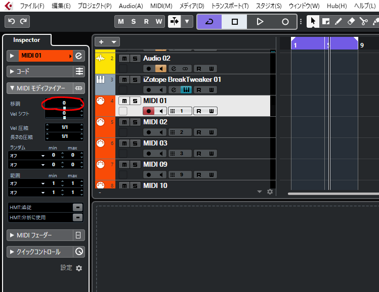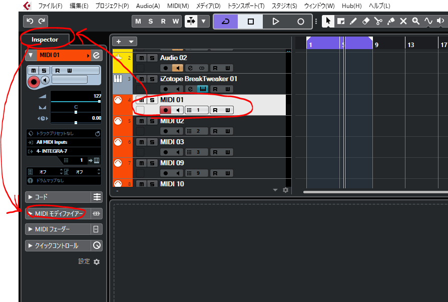 MIDIトラックを選択して、InspectorでMIDIモディファイヤーを選択します。