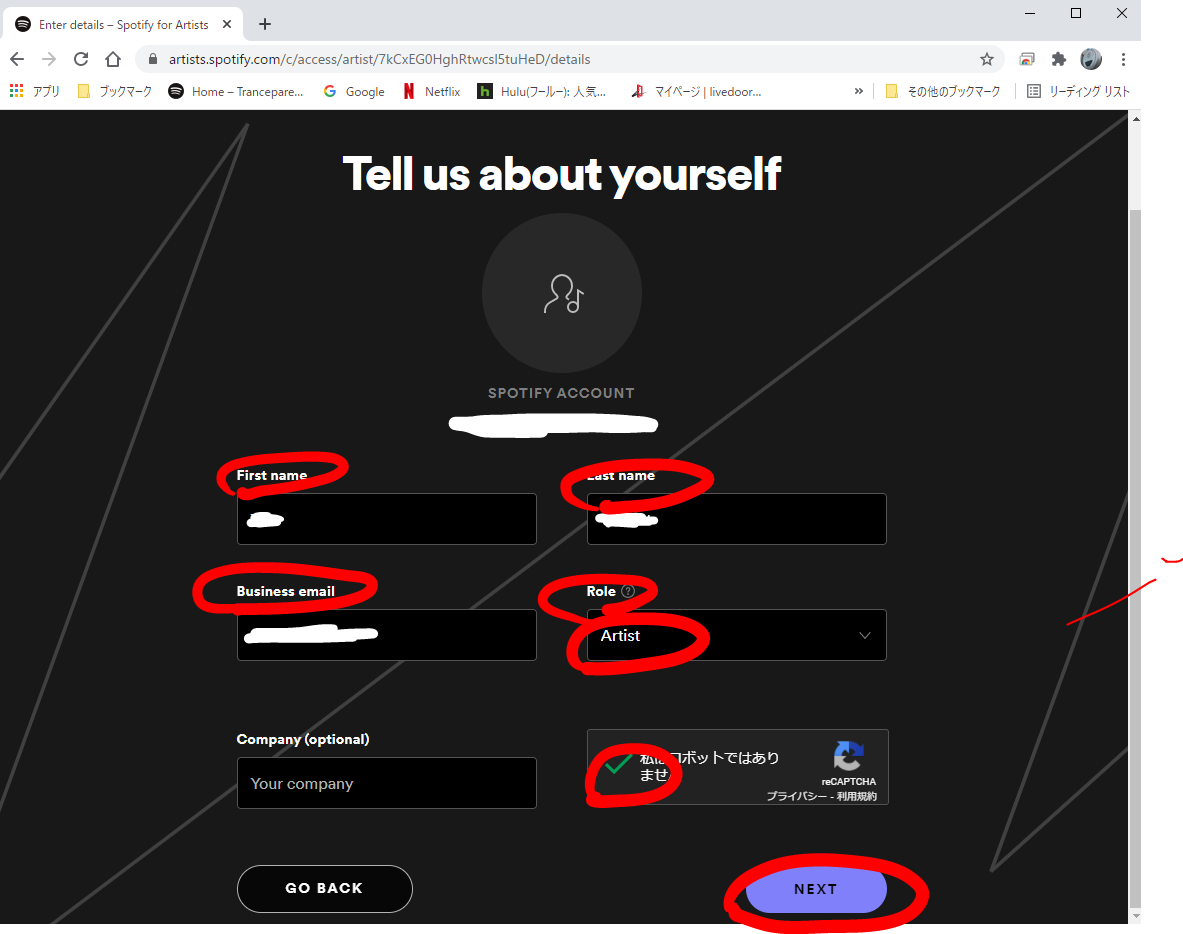10.名前、メイルアドレス、ROLE(Artistじゃないですかね)を入れてNEXTを押します。