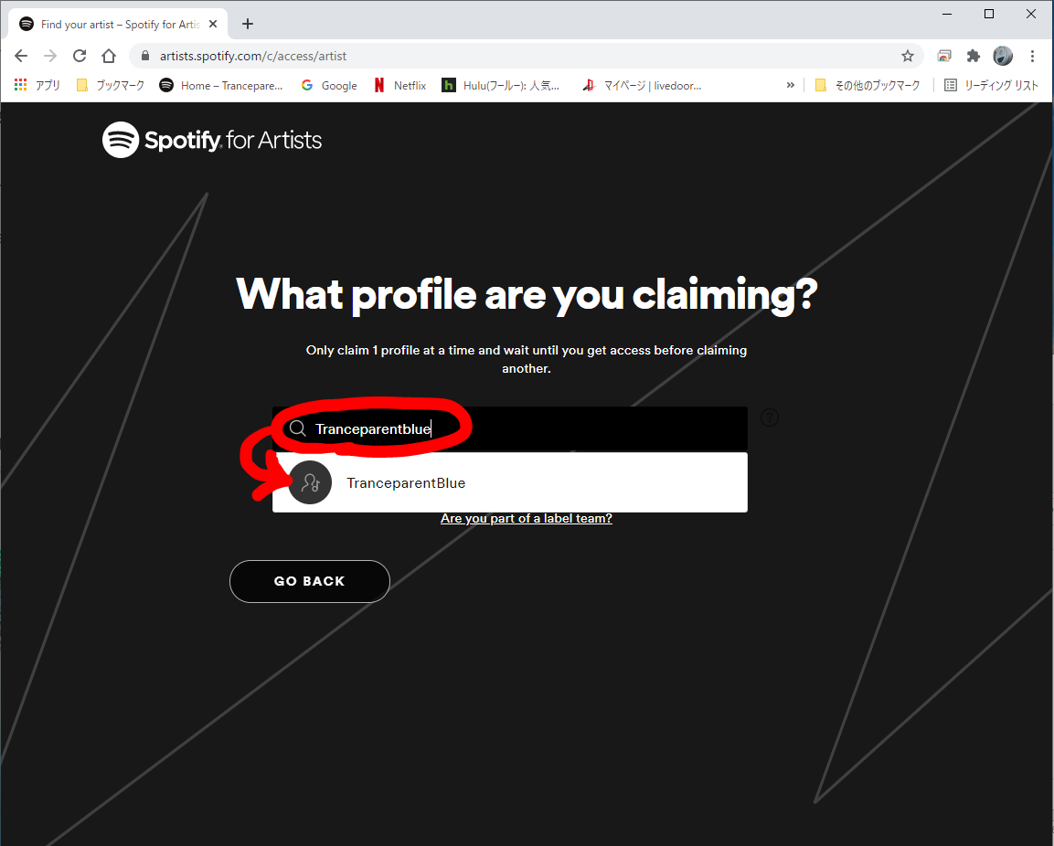 7.自分のアーティスト名を入力して、Spotifyに存在する場合は、自動的に検索結果がリスト表示されますので、選択します。