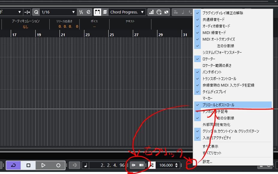 (1)まず、スコアエディタの下をマウスで右クリックして、プリロールとポストロールを選択すると、再生と停止がぼやけたようなボタンが追加されます。これがプリロールとポストロールのボタン2つです。