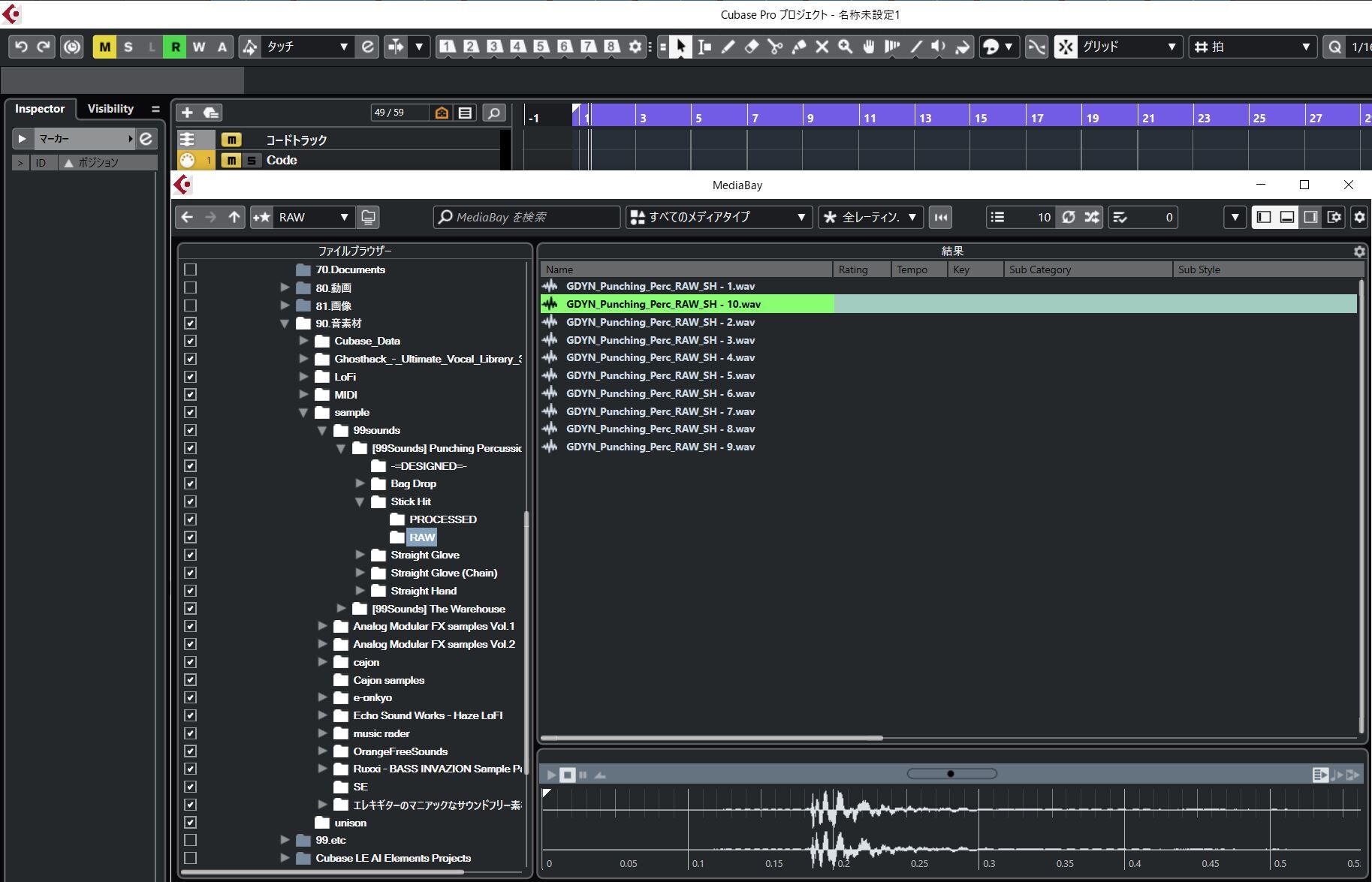 PCのフォルダが左側に表示されます。持っているWAVファイルやMIDIファイルを選択すると、自動的に再生してくれて、気に入ったものがあれば、ドラッグアンドドロップでCUBASEのプロジェクトに貼り付けることができます。