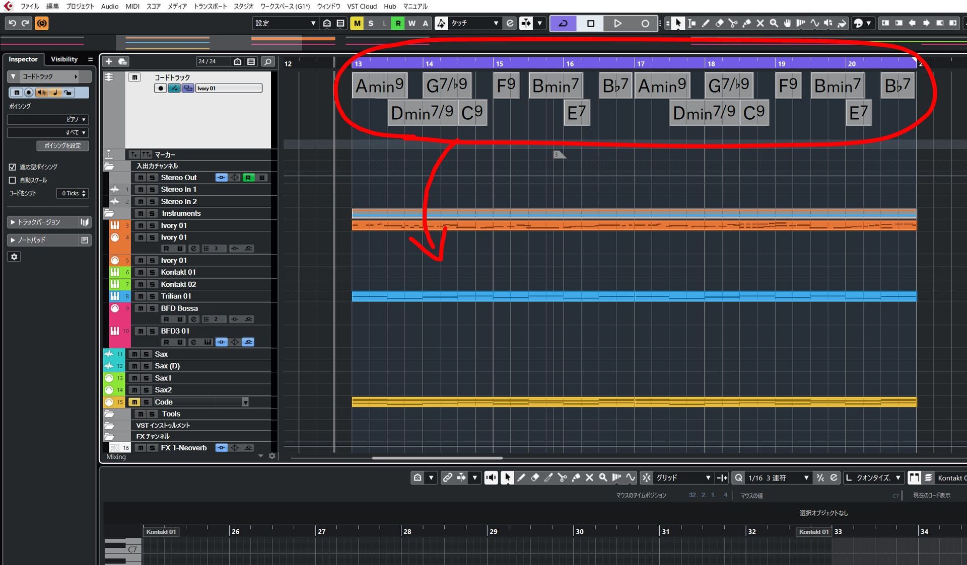 CUBASEでは、コードトラックから、任意のInstrumentsのトラックにMIDIイベントとして生成することができます。