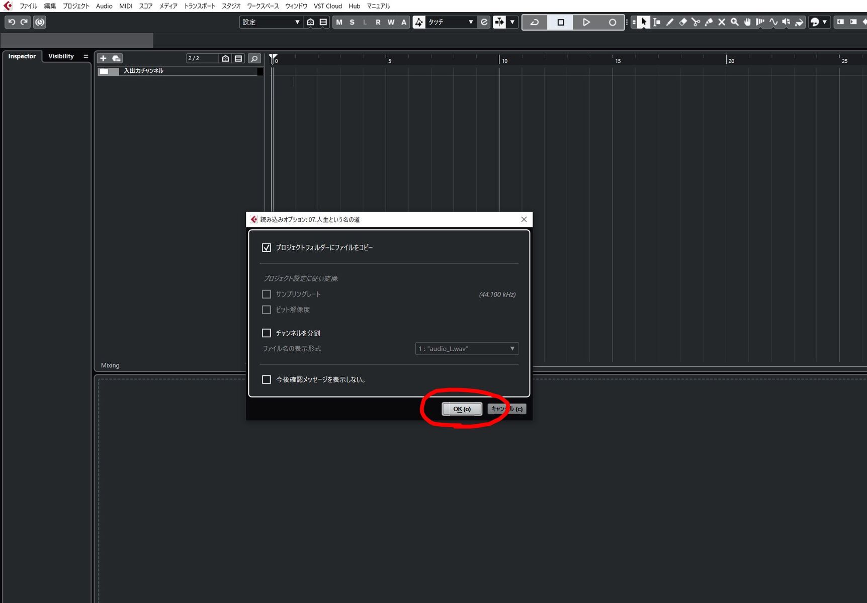 [ファイル]→[読み込み]→[オーディオファイル]でもOKです。