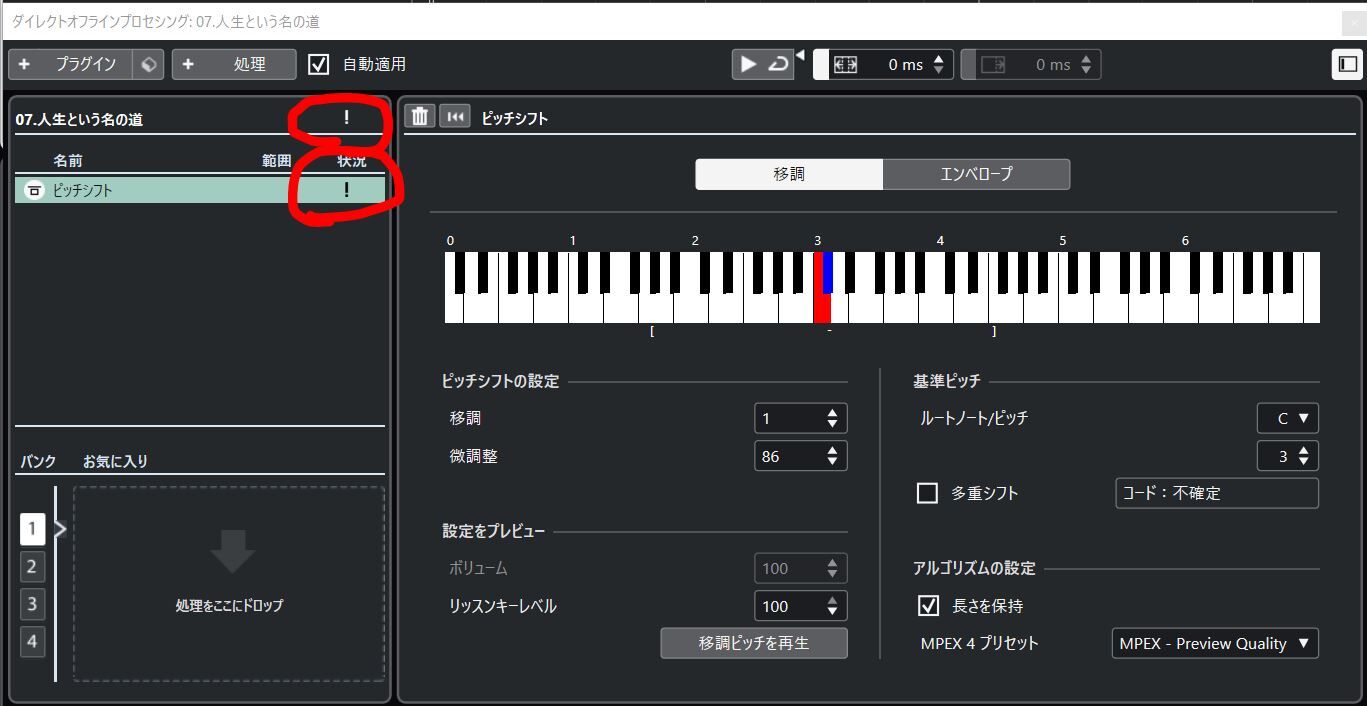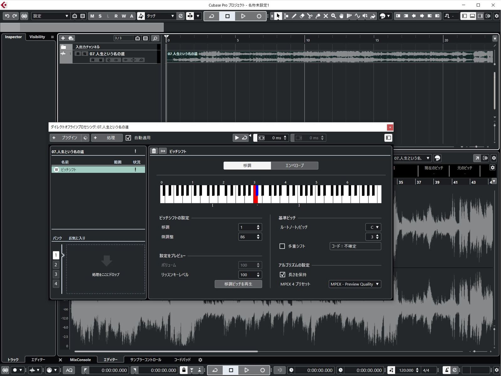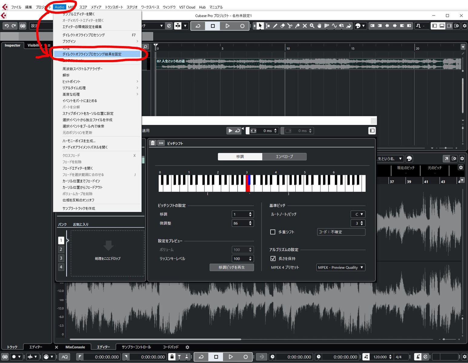 (1)CUBASEで、オーディオを編集している(2)オーディオファイルのピッチシフトがしたい