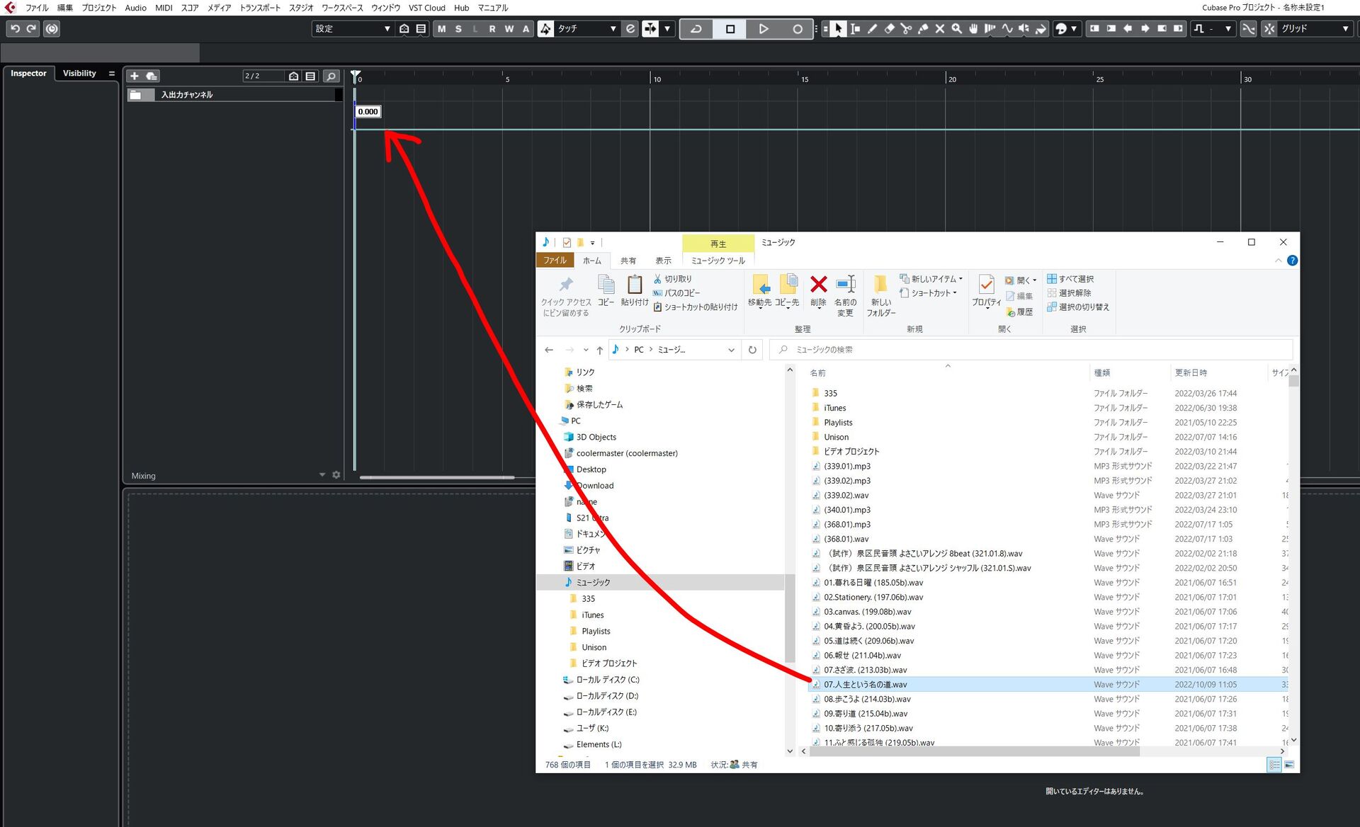 CUBASEのプロジェクトに、オーディオファイルをドラッグアンドドロップします。